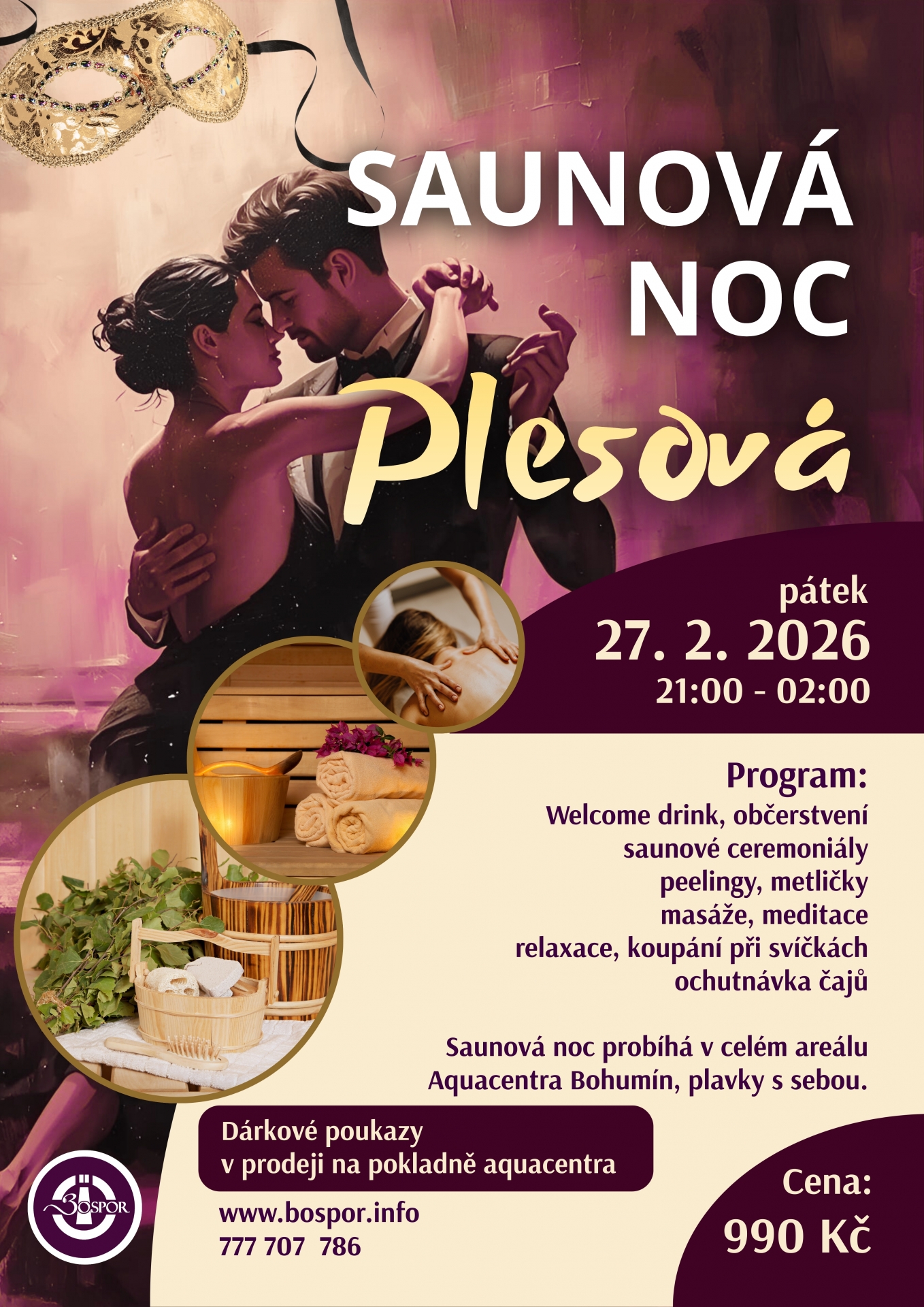 Zažijte jedinečnou saunovou noc v celém areálu Aquacentra Bohumín. Čeká vás bohatý relaxační program, romantická atmosféra a nezapomenutelné zážitky.